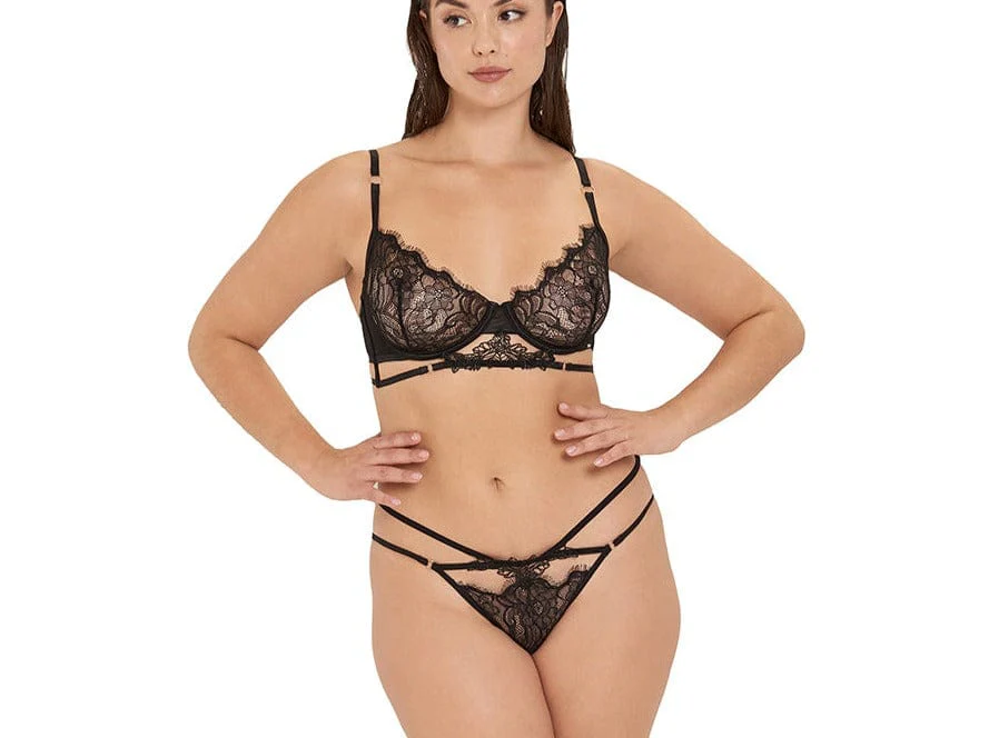 An intricate bra combining soft lace with directional design. The beautiful eyelash lace creates a light, sheer cup, with a contrast lace central panel linking to a slim, elasticated under band embellished with gold-tone rings. Soft side boning brings added support, whilst superfine mesh sits soft against the body in the side and back straps.